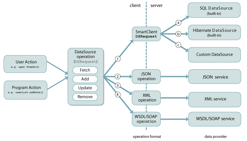 Server-side integration: DataSource requests from the browser arrive as Java Objects on the server. You deliver responses to the browser by returning Java Objects. The various server-side integration possibilities are discussed later in this article.Client-side integration: DataSource requests arrive as simple HTTP requests which your server code receives directly (in Java, you use the Servlet API or .jsps to handle the requests). Responses are sent as XML or JSON which you directly generate.