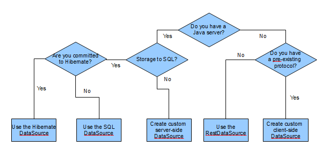 SQLDataSource vs JPA/Hibernate in order to understand the large benefits the SQLDataSource providesautoDeriveSchema feature, or from Java Beans via the schemaBean feature. Or, use the Admin Console to generate tables from DataSource definitions you create by handschemaBean feature to derive DataSource definitions from any Java beancustom DataSource that provides the CRUD operations you want to support.DMI, or any combination of the two: OperationBinding allow you to dynamically set data values at transaction-processing time, using built-in Velocity supportvalidate() method of the DataSource to provide extra custom validations - just call super to obtain the list of errors derived from Smart GWT validations, then add to that list as required with your own custom codeexecute() method of the DataSource to add extra processing either before or after the Smart GWT processingTransaction Chaining to dynamically set data values according to the results of earlier transactionsSQL Templating to change, add to or even completely replace the SQL sent to the database, and to implement special query requirementscustom JQL queries to implement special query requirementscustom HQL queries to implement special query requirementsthe server integration overview. RestDataSourceclient-side data integration features to create a custom client-side DataSource that adapts the DataSource protocol to your existing services